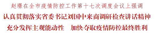 趙璟指出,在我市疫情防控掃尾階段,省委書記劉國中再次來商調(diào)研檢查,充分肯定我市近期工作成效,對我們一鼓作氣打贏疫情防控殲滅戰(zhàn)提出要求,充分體現(xiàn)了省委對商洛工作的高度重視和對全市干部群眾的深切關懷。全市上下要堅持“外防輸入、內(nèi)防反彈”總策略和“動態(tài)清零”總方針,認真貫徹落實劉國中同志講話精神,增強“時時放心不下”的責任感,充分發(fā)揮主觀能動性,始終保持良好狀態(tài),加壓加速、奮力沖刺,堅決奪取疫情防控最終勝利,為黨的二十大勝利召開營造安全穩(wěn)定的社會環(huán)境。