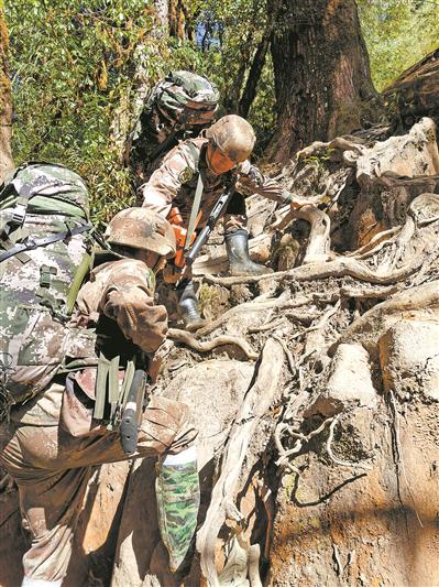 巡邏路上,會遇到很多大大小小的斷崖。每一次,侯云都先爬上去,再把戰(zhàn)士一個(gè)個(gè)拉上來。而到了危險(xiǎn)的濕滑陡坡,他會留在隊(duì)伍后面,把戰(zhàn)士一個(gè)個(gè)推上去。