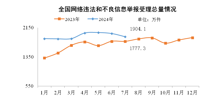 2024年7月,中央網(wǎng)信辦舉報(bào)中心指導(dǎo)全國(guó)各級(jí)網(wǎng)信舉報(bào)工作部門、主要網(wǎng)站平臺(tái)受理網(wǎng)民舉報(bào)色情、賭博、侵權(quán)、謠言等違法和不良信息1904.1萬件,環(huán)比下降4.4%、同比增長(zhǎng)7.1%。其中,中央網(wǎng)信辦舉報(bào)中心受理舉報(bào)42.5萬件,環(huán)比下降9.4%、同比增長(zhǎng)3%;各地網(wǎng)信舉報(bào)工作部門受理舉報(bào)103萬件,環(huán)比下降19.1%、同比增長(zhǎng)49.7%;全國(guó)主要網(wǎng)站平臺(tái)受理舉報(bào)1758.7萬件,環(huán)比下降3.3%、同比增長(zhǎng)5.5%。