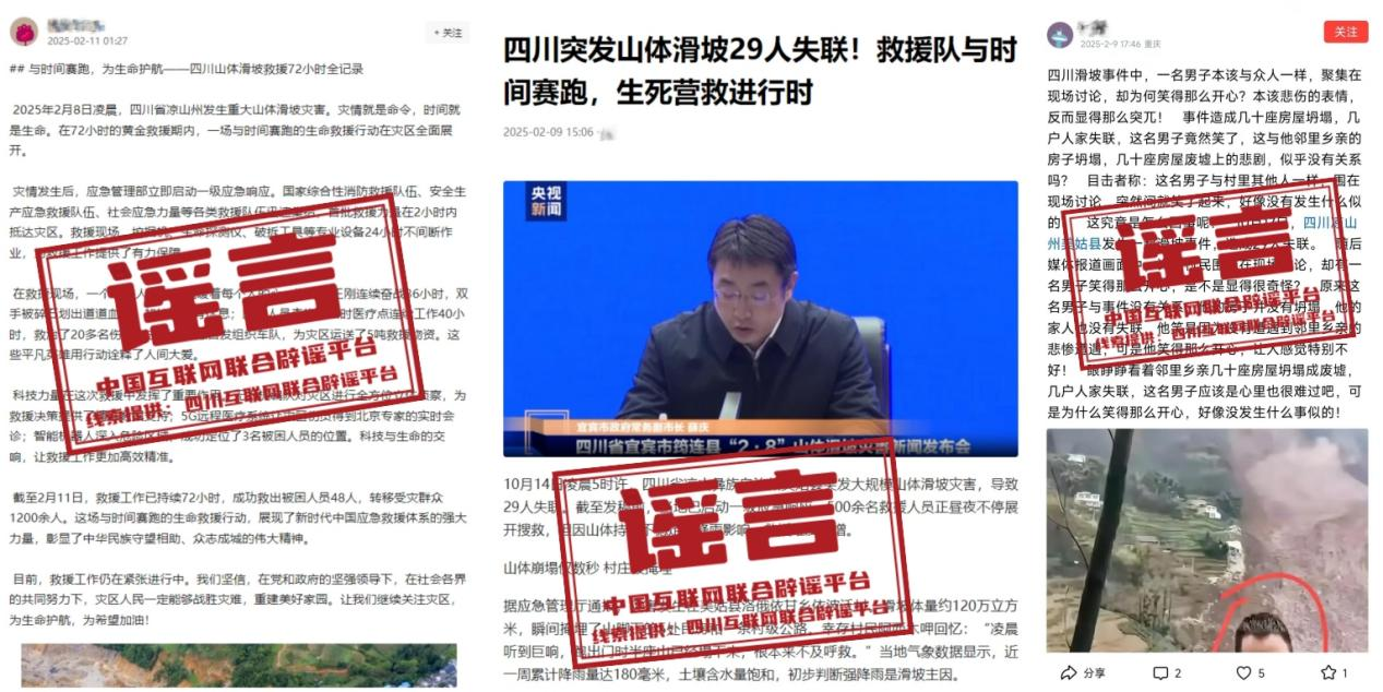 2月9日,有網(wǎng)民在某網(wǎng)絡(luò)平臺發(fā)布題為《30人被埋!四川山體崩塌瞬間曝光,行車記錄儀拍下死神奪命10秒》的帖文。經(jīng)核實,帖文配圖均為嫁接舊聞、圖文翻炒,網(wǎng)民將2024年8月茂縣山體滑坡救援現(xiàn)場、2016年12月宜賓市長寧縣下長鎮(zhèn)永利村一村民被推土機掩埋致死事件的舊聞重新拼接合成,編造為宜賓筠連山體滑坡最新動態(tài)后發(fā)布。(來源:四川互聯(lián)網(wǎng)舉報辟謠平臺、宜賓網(wǎng)警)