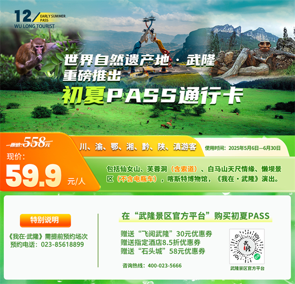 @川渝鄂湘黔陜滇籍的朋友們,還在煩惱5、6月去哪找清涼?這不武隆景區(qū)新推出的初夏Pass為你解憂了,你跟著沖就對了!2025年5月6日—6月30日期間,川渝鄂湘黔陜滇籍游客,轉(zhuǎn)發(fā)武隆旅游Pass卡相關信息到朋友圈,只需59.9元,就能解鎖價值558元的仙女山、芙蓉洞(含索道)、白馬山天尺情緣、懶壩(不含電瓶車)景區(qū),《我在·武隆》演出,喀斯特博物館,簡直是性價比天花板!
