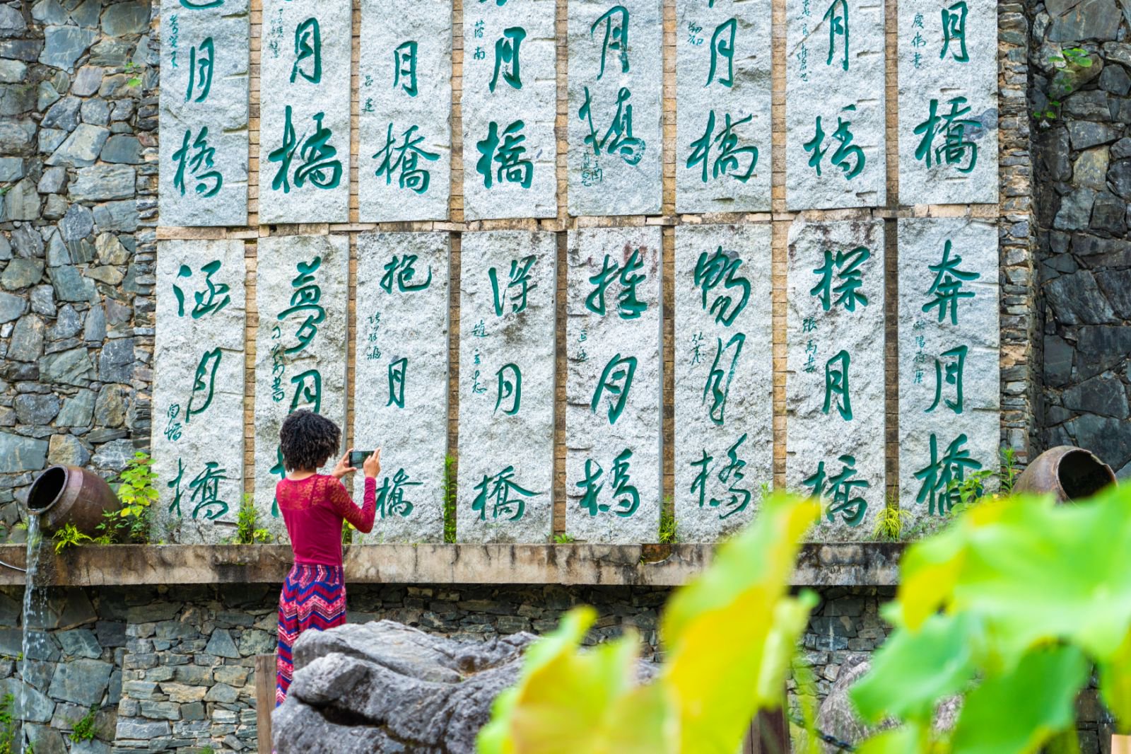 隨后,艾芙琳探訪了入選“國家森林養(yǎng)生重點建設基地”的二十四橋明月園。這座占地3150畝的綜合性莊園以月亮文化和橋文化為主題,融合農業(yè)觀光、森林康養(yǎng)、民俗體驗于一體。園內自產自足的綠色食材、百畝花海、24座特色小橋,以及書法家創(chuàng)作的“明月”主題作品,令艾芙琳連連稱贊:“這里實現(xiàn)了人與自然的完美共生。” 艾芙琳正在拍攝石刻書法作品 陳旅 攝