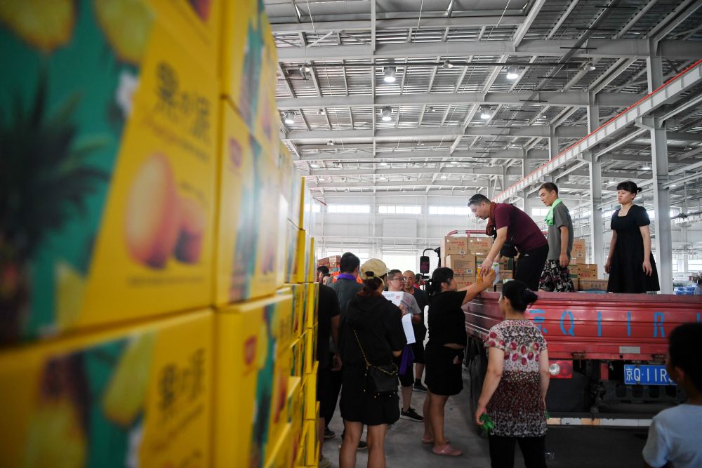 工作人員和志愿者在河北省涿州市鋼研物資儲(chǔ)備點(diǎn)內(nèi)將捐贈(zèng)物資裝車(chē)外運(yùn)(8月5日攝)。新華社記者 牟宇 攝