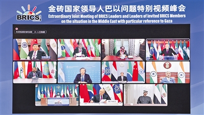 習(xí)近平強(qiáng)調(diào),金磚合作機(jī)制是新興市場(chǎng)國(guó)家和發(fā)展中國(guó)家加強(qiáng)團(tuán)結(jié)合作、維護(hù)共同利益的重要平臺(tái)。今天,我們就巴以問(wèn)題協(xié)調(diào)立場(chǎng)、采取行動(dòng),為擴(kuò)員后的“大金磚合作”開(kāi)了個(gè)好頭。中方愿同其他成員一道,開(kāi)創(chuàng)金磚合作新時(shí)代。