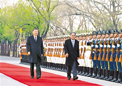 四月九日下午,國家主席習近平在北京人民大會堂同來華進行國事訪問的密克羅尼西亞聯(lián)邦總統(tǒng)西米納舉行會談。這是會談前,習近平在人民大會堂東門外廣場為西米納舉行歡迎儀式。