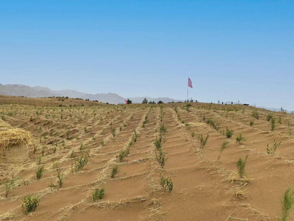 寧夏吳忠市鹽池縣和內蒙古鄂爾多斯市鄂托克前旗交界處的流動沙丘,今年剛剛完成治理。(孫果攝)