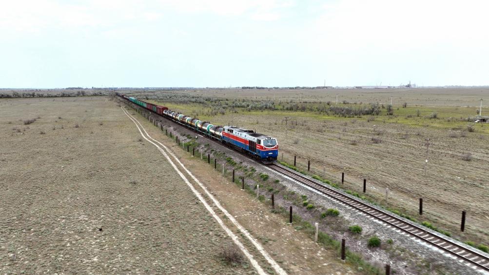 2023年5月12日,在哈薩克斯坦阿拉木圖附近,貨運(yùn)列車馳騁于阿拉木圖與中國(guó)霍爾果斯間(無人機(jī)照片)。新華社發(fā)(奧斯帕諾夫攝)
