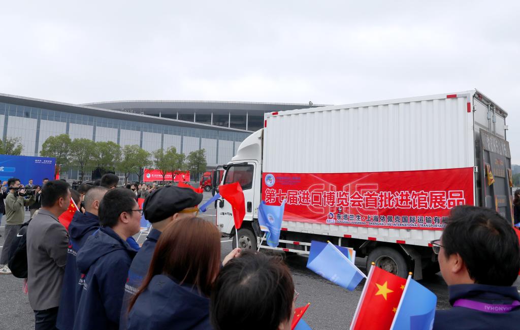 10月22日,裝載首批進館展品的卡車駛入儀式現(xiàn)場。當日,第七屆中國國際進口博覽會首批展品進館儀式在國家會展中心(上海)舉行。新華社記者方喆攝