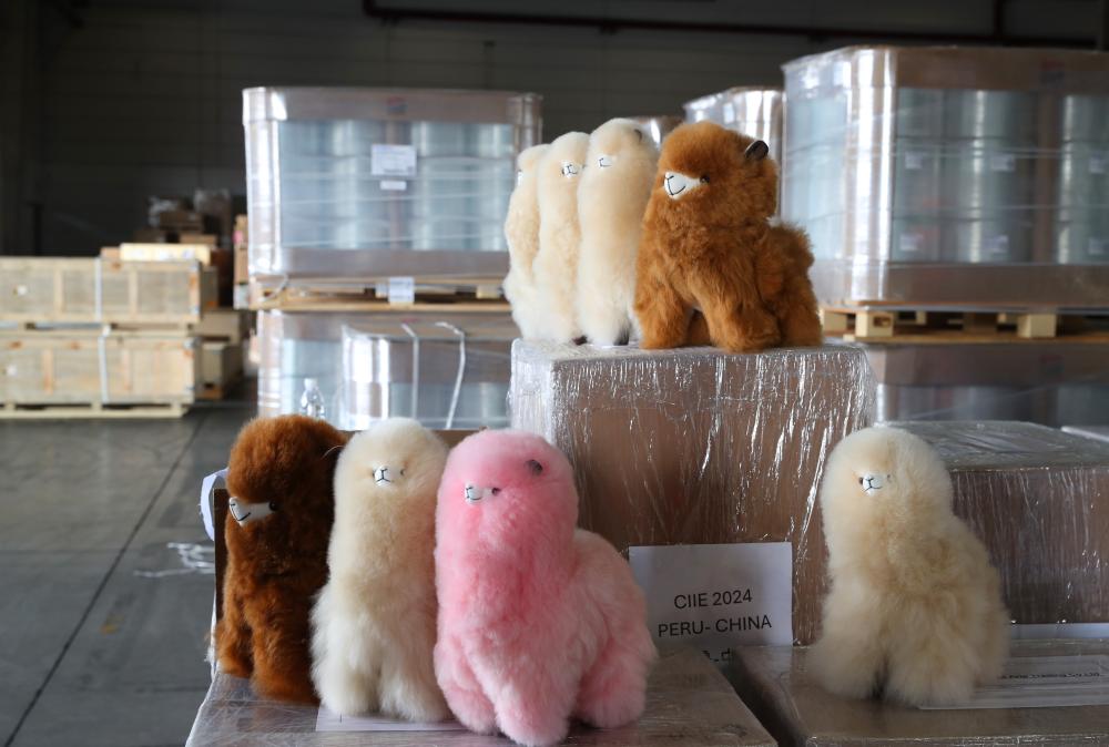 10月14日拍攝的運抵中遠海運自有倉庫的“溫暖駝”產品。當日,中遠海運承運的第七屆進博會海運首單展品秘魯“溫暖駝”系列產品由洋山港碼頭運抵中遠海運自有倉庫,隨后改換短駁廂式車送往客戶公司。新華社記者方喆攝