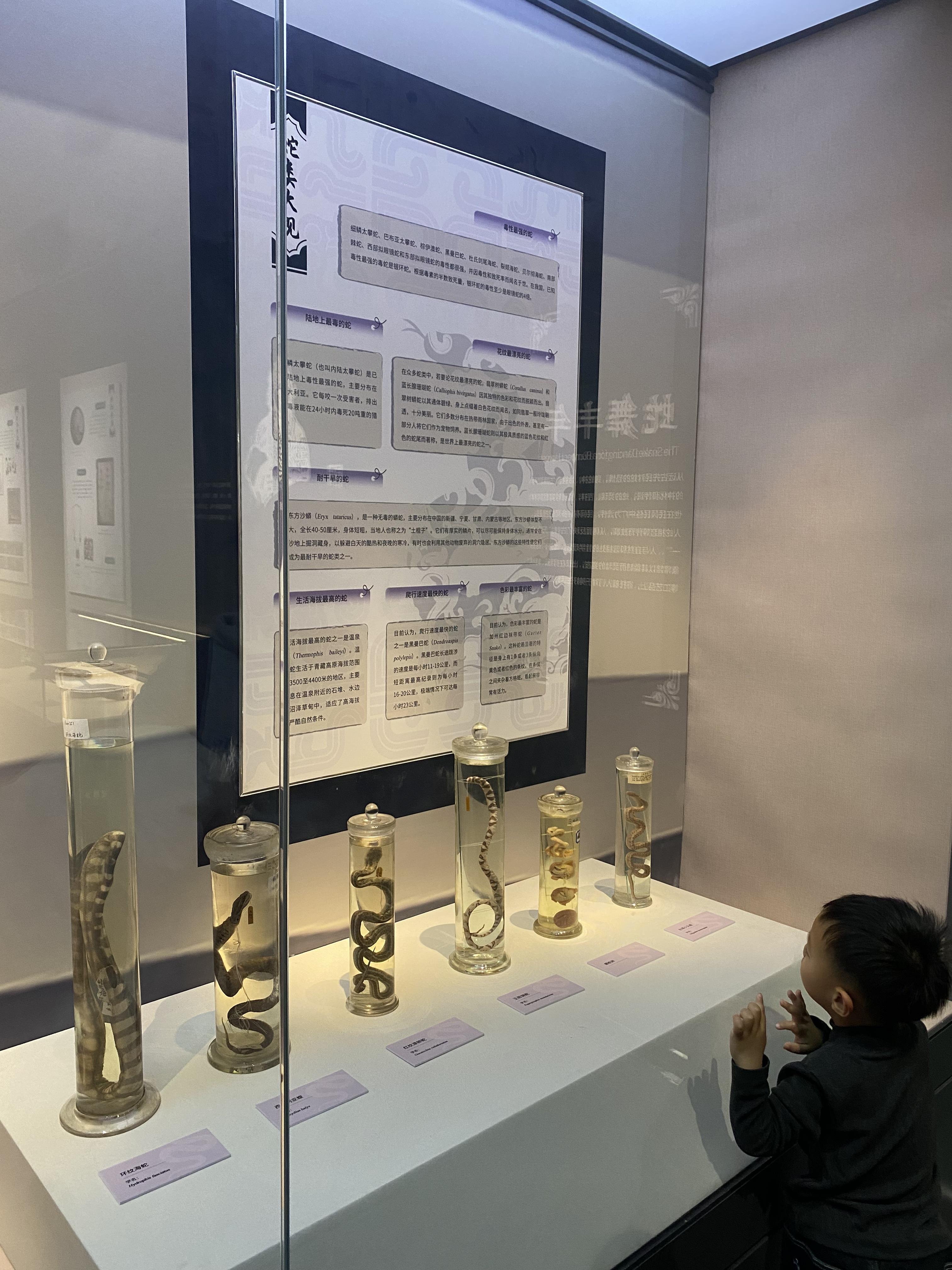 浸泡于玻璃瓶中的蛇、纏繞在“樹(shù)干”上的蛇、揚(yáng)首疾行的蛇,細(xì)密的蛇骨骼,盤曲的蛇藥材……近50件精挑細(xì)選的珍稀蛇類標(biāo)本類型豐富、姿態(tài)自然、做工精致,加深著人們對(duì)蛇類演化、結(jié)構(gòu)特征、行為習(xí)性、種類分布等知識(shí)的印象。