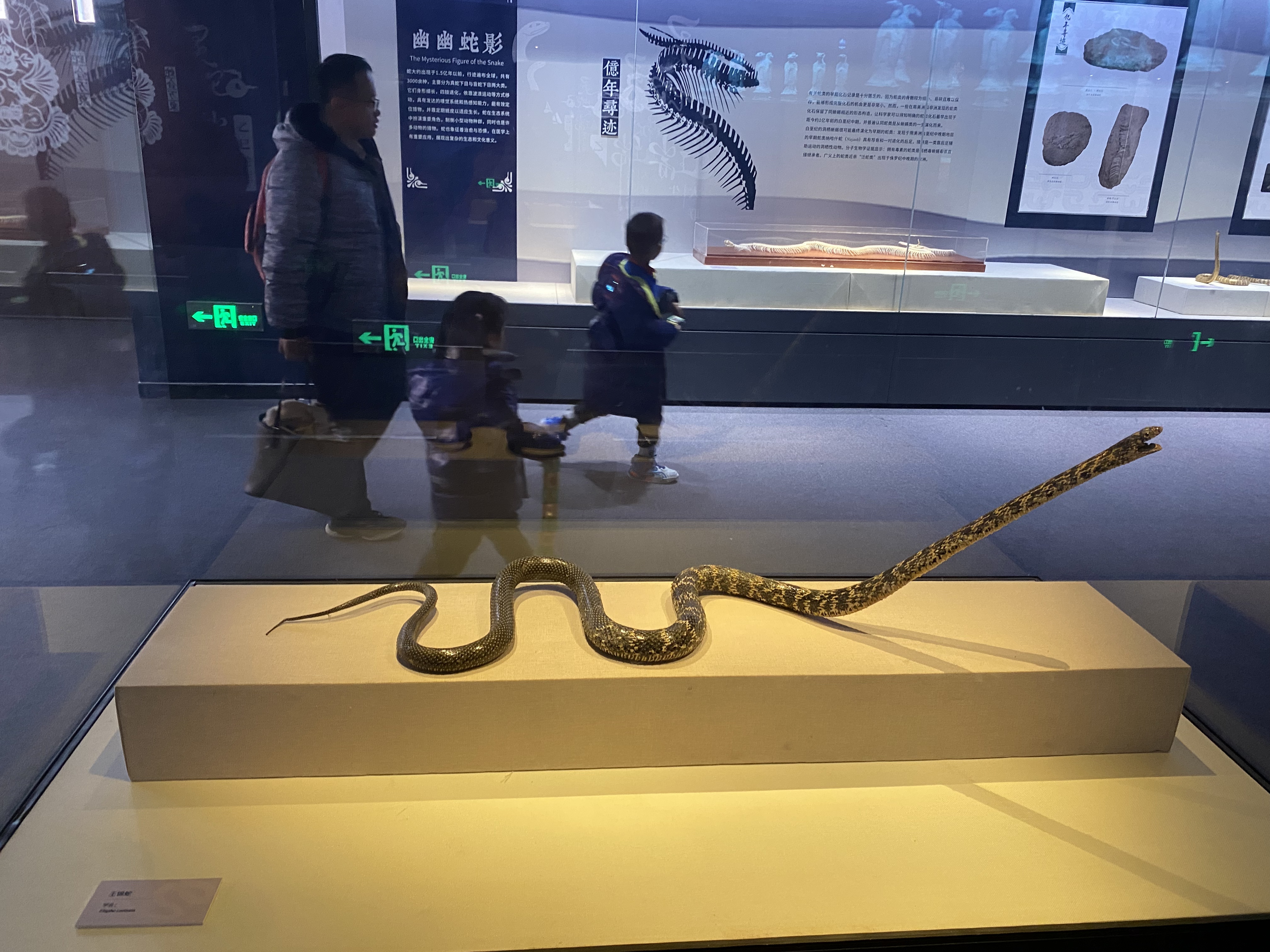 作為脊椎動(dòng)物的成員,起源自陸生蜥蜴的蛇類也在演繹著別樣的精彩。在緊鄰中央展廳的臨展廳,同步亮相的“靈蛇獻(xiàn)瑞——2025乙巳蛇年生肖文物大聯(lián)展”借著中國(guó)農(nóng)歷蛇年到來(lái)的契機(jī),吸引不少觀眾在觀“龍”后又來(lái)尋“蛇”。