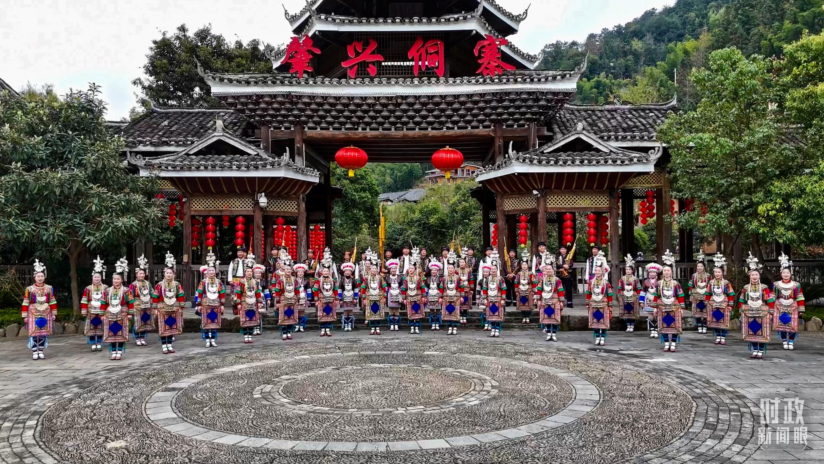 △寨門處,鄉(xiāng)親們身著傳統(tǒng)服飾,唱起侗族大歌,歡迎遠(yuǎn)方的來客。(總臺(tái)央視記者范凱拍攝)