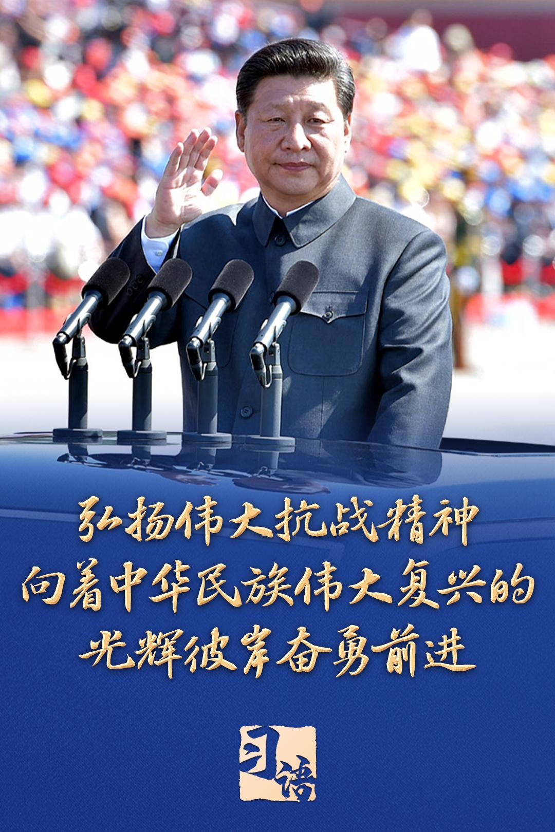 “新的歷史條件下,全黨全國各族人民要大力弘揚偉大抗戰(zhàn)精神,不斷增強團(tuán)結(jié)一心的精神紐帶、自強不息的精神動力,繼續(xù)朝著中華民族偉大復(fù)興的中國夢奮勇前進(jìn),不斷以堅持和發(fā)展中國特色社會主義的新成就告慰我們的前輩和英烈!”