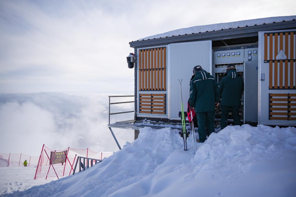 齊凡和哈依沙爾帶著雪具乘纜車抵達(dá)海拔2800米的云霄峰頂,這里是高級(jí)雪道的起點(diǎn),也是電力保障的重中之重。
