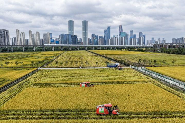 2025年10月21日,收割機(jī)在浙江省杭州市蕭山區(qū)世紀(jì)田園糧食功能區(qū)的稻田里收割水稻,遠(yuǎn)處高鐵列車(chē)飛馳而過(guò)(無(wú)人機(jī)照片)。新華社記者 徐昱 攝