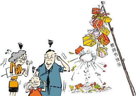 網(wǎng)友“臨窗對雨”的一片博文寫出了不少老師的心聲。“每到教師節(jié),學(xué)生的祝賀卡片像雪花一樣飛來,自然是滿懷喜悅??墒?,我也總是為家長送來的禮物而苦惱??倳鎸ο矚g送禮的家長,盡管有些家長幾年來沒有向我送過一件禮物,我也會對他的孩子一視同仁。”他說,做教師最大的快樂,是得天下英才而育之。而最大的欣慰,莫過于多少年以后,當(dāng)初你教育過的學(xué)生依然深深地記住你這位老師。而家長的禮物,卻在其中扮演著極不光彩的角色。