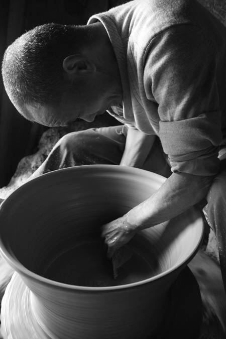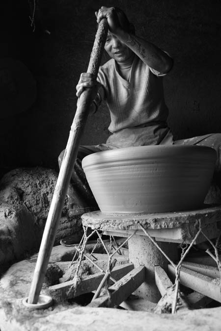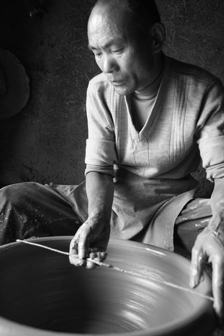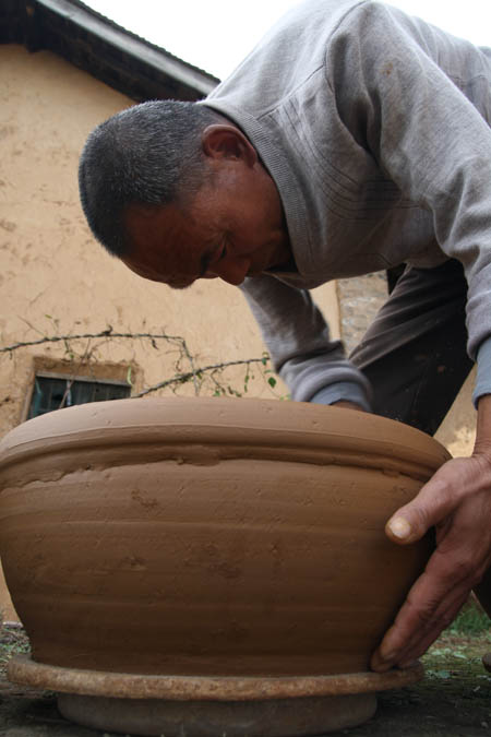 制陶的程序并不復(fù)雜,經(jīng)和泥、盤泥、臥泥,然后開始制作,晾曬到燒制。制作將泥放在輪盤上,用腳轉(zhuǎn)動(dòng)輪盤,雙手仔細(xì)變化手勢(shì),泥在郝悶長(zhǎng)的手中不斷的變化各種形態(tài)。