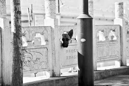 近日,丹江公園內(nèi)一只大狼狗經(jīng)常藏在欄桿后面,只露出一個狗頭,讓不少行人受到驚嚇。