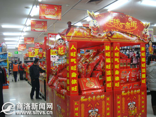 市區(qū)的幾家超市門口張貼了顯眼的“福到”、“兔年大吉”等字畫,紅燈籠、中國結(jié)、對聯(lián)、福字被各個(gè)商場擺在了最顯眼的位置。除了這些,在超市,最受消費(fèi)者歡迎的就是糖果,飲料和保健品。