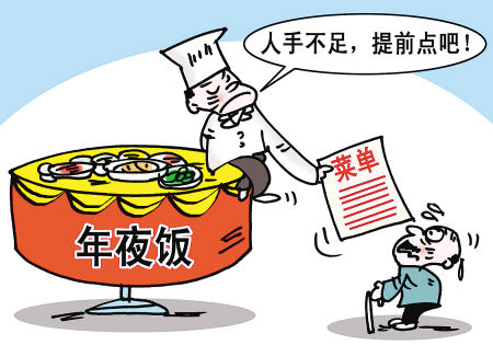 據(jù)錦都酒店的餐飲部工作人員說,今年的訂餐從2010年12月初就開始了,他們準備了六七十桌,元月中旬就已經(jīng)訂滿。為了解決餐位緊張的情況,各大飯店紛紛采取了分時段預訂年夜飯的措施。