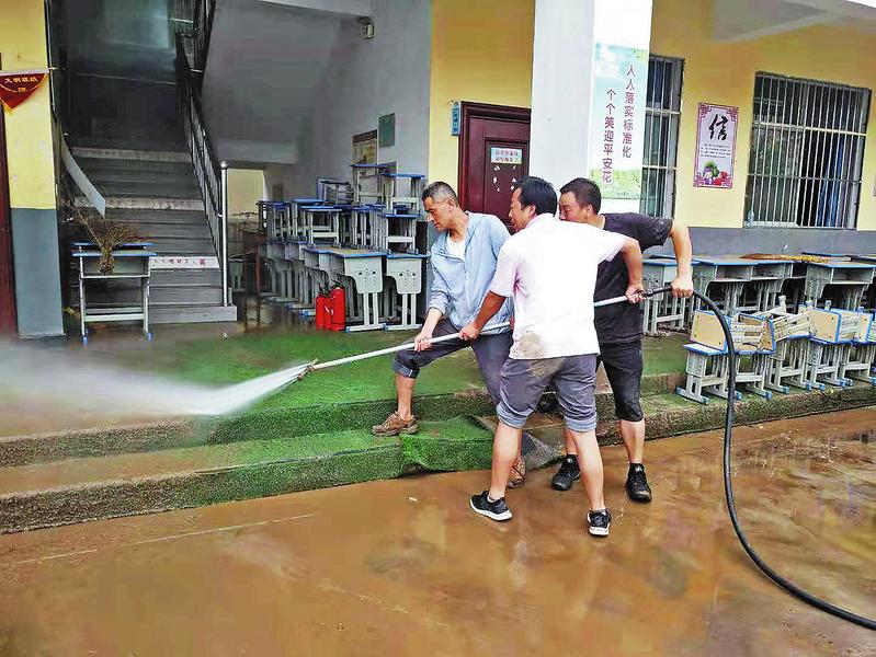 張棟良立刻組織召開支委會,向全鎮(zhèn)小學(xué)及幼兒園教師發(fā)出救災(zāi)倡議書,號召大家積極參加抗洪救災(zāi)。各校教師紛紛響應(yīng),自帶救災(zāi)工具,前往中心小學(xué)救災(zāi)。從8月6日開始,共出動268人次,出動裝載機1臺,購置發(fā)電機1臺、水泵3臺、鐵锨60把。各小組、各突擊隊、各教師均按照分工有條不紊地開展清淤、災(zāi)后防疫消毒等工作。聽說家鄉(xiāng)石門災(zāi)情嚴(yán)重,張棟良只能眼望家鄉(xiāng),祈求家人平安。