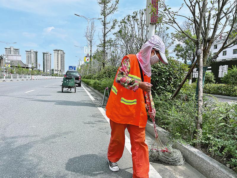 今年50歲的王粉如,從事環(huán)衛(wèi)工作已經(jīng)有8年了,負(fù)責(zé)國際會(huì)議中心到沙河子路段的保潔工作。這個(gè)路段工作組共有90名環(huán)衛(wèi)工人,一天兩班倒,不論天晴下雨,始終堅(jiān)守在自己的崗位上。中午時(shí)分,王粉如臉上掛滿了汗珠,橙色的工作服上被汗水凝結(jié)出一片片“醒目”的白色汗?jié)n。她告訴記者:“最近常有暴雨,一下完大雨我們就會(huì)立馬清掃地面積水,不然就會(huì)影響大家出行,有時(shí)候換班時(shí)間掃不完,大家就都加班加點(diǎn)掃。”