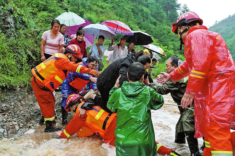 消防救援人員立即與當?shù)馗刹堪ぜ野羲阉?,將所有被困群眾統(tǒng)一到一處,然后集中護送。由于滯留群眾大多數(shù)為兒童、婦女和老人,消防救援人員利用肩扛、背馱以及平板車護送被困群眾前往安全地帶。
