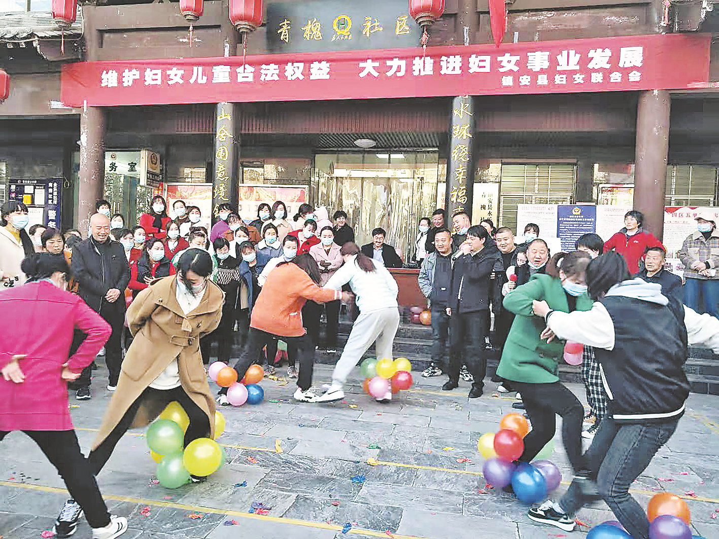 ?、?月7日,鎮(zhèn)安縣永樂(lè)街辦青槐社區(qū)舉行“相約‘三八’、樂(lè)在社區(qū)”趣味運(yùn)動(dòng)會(huì),具有農(nóng)耕農(nóng)趣農(nóng)味的踩氣球、搶座位、運(yùn)送乒乓球、拔河等比賽活動(dòng),受到了社區(qū)女干部和群眾的歡迎。(侯欽彬 攝)