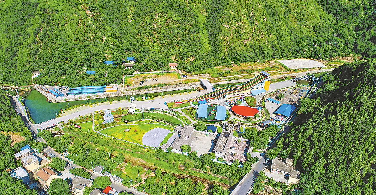 近年來,我市各地將秦嶺山水鄉(xiāng)村建設(shè)作為推動鄉(xiāng)村振興的重要抓手,對標(biāo)“六清六治六無”目標(biāo),因地制宜、分類施策,打造美麗和諧宜居村莊。圖為5月19日航拍的丹鳳縣商鎮(zhèn)保定村游樂場。 (本報(bào)記者 胡 蝶 攝)