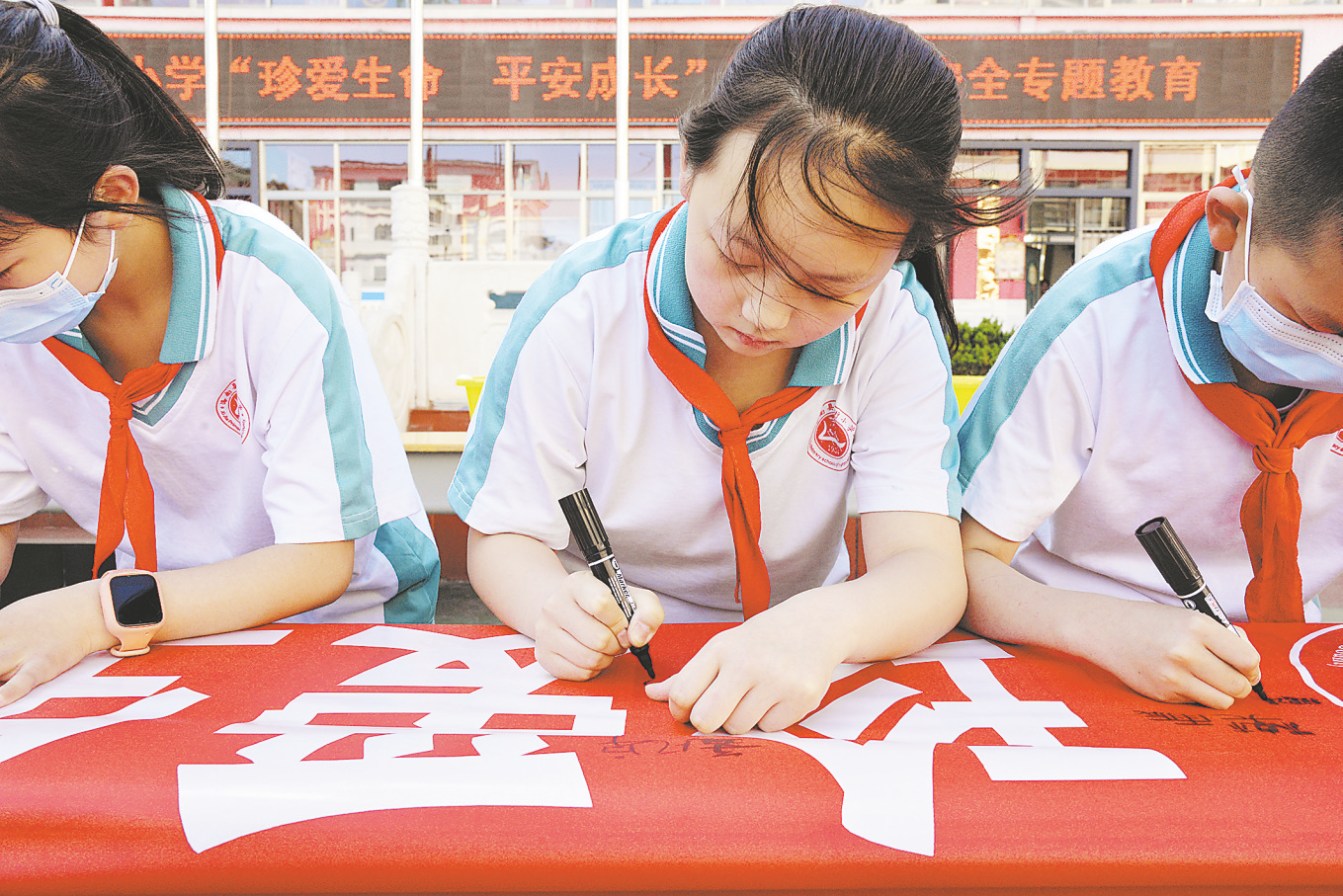 學(xué)生在防溺水安全主題教育橫幅上簽名承諾