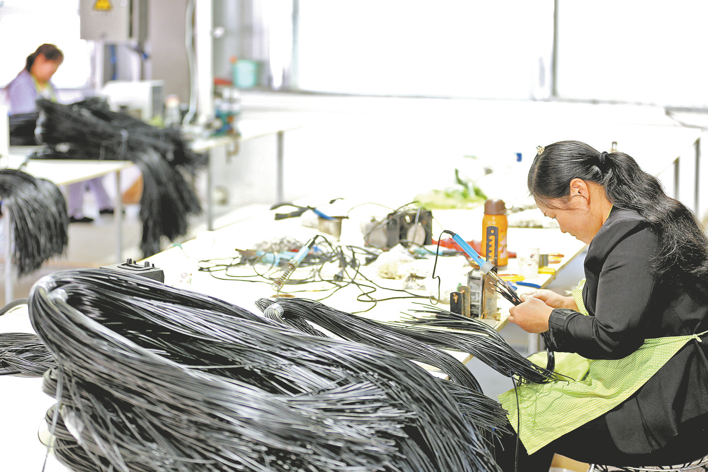 社區(qū)工廠為農(nóng)村剩余勞動(dòng)力提供了就業(yè)機(jī)會(huì)。圖為留守婦女正在忙碌地組裝產(chǎn)品。