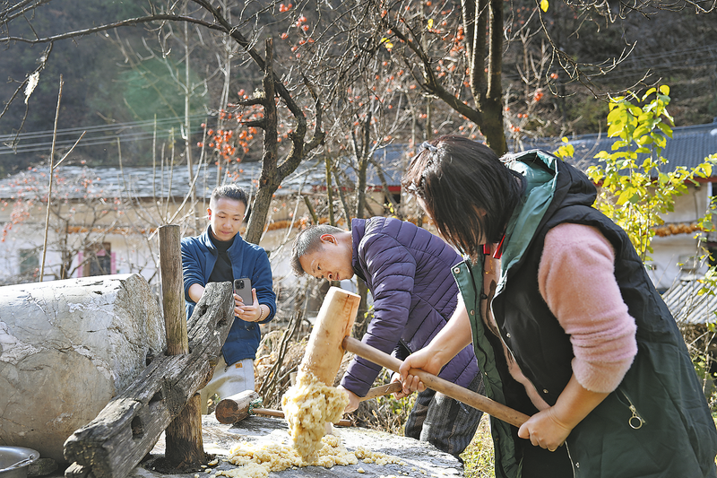 鄭彬向魚勇和張斐演示拍攝打糍粑的角度