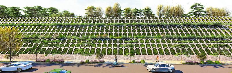 環(huán)城北路邊坡治理工程點(diǎn)狀分布于環(huán)城北路全段道路兩側(cè)。工程主要通過拱形骨架、抗滑樁、混凝土擋墻加固因2021年暴雨損毀的護(hù)坡,并對(duì)護(hù)坡周邊山體進(jìn)行生態(tài)修復(fù),實(shí)施邊坡立體綠化,有效改善環(huán)城北路兩側(cè)生態(tài)環(huán)境,有力保障城市道路運(yùn)行安全。