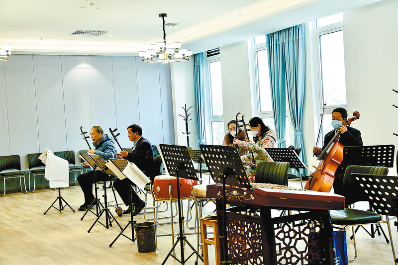 在金山康養(yǎng)城休閑娛樂中心,老人們自發(fā)組織樂團(tuán)排練樂曲。