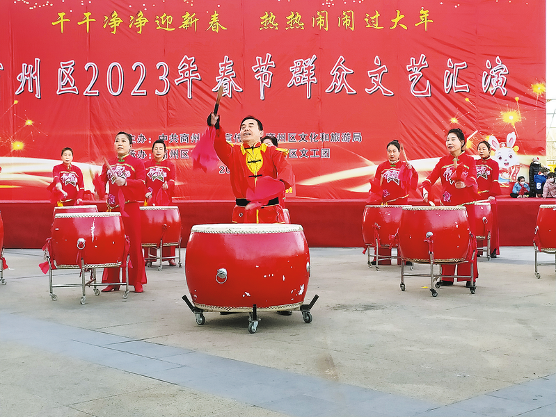 1月29日,在市區(qū)西街大都匯廣場(chǎng),商州風(fēng)威鑼鼓隊(duì)為市民獻(xiàn)上歡慶鑼鼓鬧新春節(jié)目,吸引了眾多群眾觀看,為新年?duì)I造了熱熱鬧鬧的氛圍。 (本報(bào)記者 賈書章 攝)