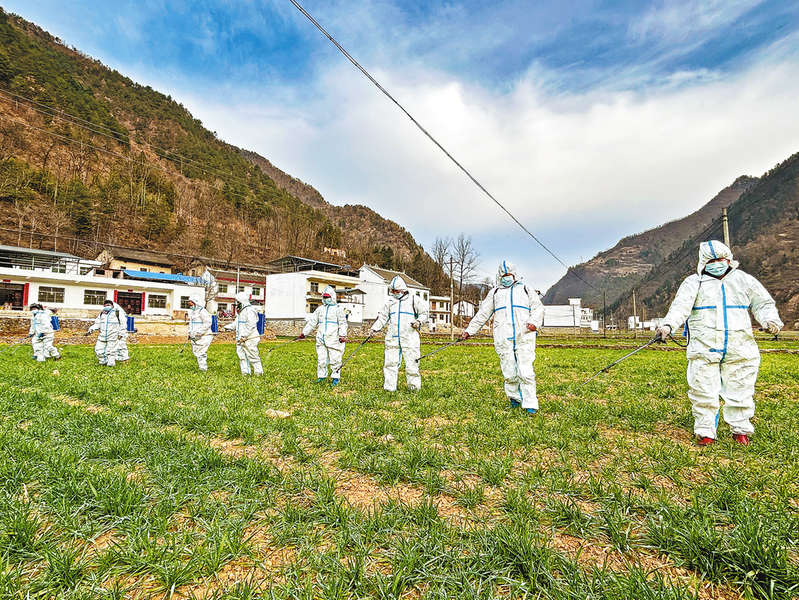 眼下正是小麥春季田間管理的關(guān)鍵時期,我市各地搶抓農(nóng)時節(jié)令,積極開展管護工作,為夏糧豐產(chǎn)豐收打下基礎(chǔ)。圖為2月20日,山陽縣農(nóng)技人員在色河鋪鎮(zhèn)屈家澗村,采用人工噴灑和植保無人機噴灑相結(jié)合的方式,對集中成片的麥田開展統(tǒng)防統(tǒng)治。 (本報記者 肖 云 攝)