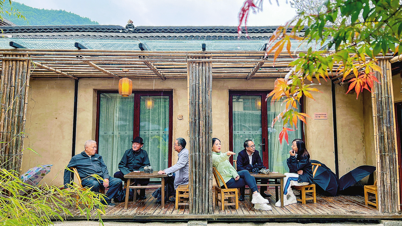 在柞水縣營(yíng)盤鎮(zhèn)朱家灣村的特色民宿陽(yáng)坡院子里,散文名家們?cè)谟曛袝痴劇?(本報(bào)記者 米子揚(yáng) 攝)