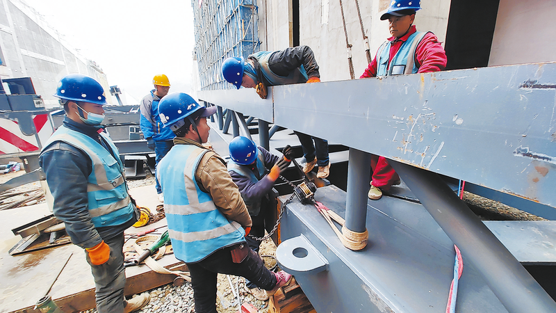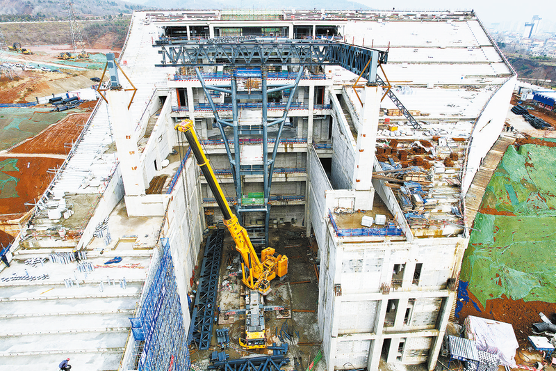 12月11日,氣溫驟降,寒氣襲人。在秦嶺博物館項(xiàng)目施工現(xiàn)場(chǎng),50多米高的大型吊車旁,10多名工人正在進(jìn)行博物館中廳巨型鋼結(jié)構(gòu)的吊裝。