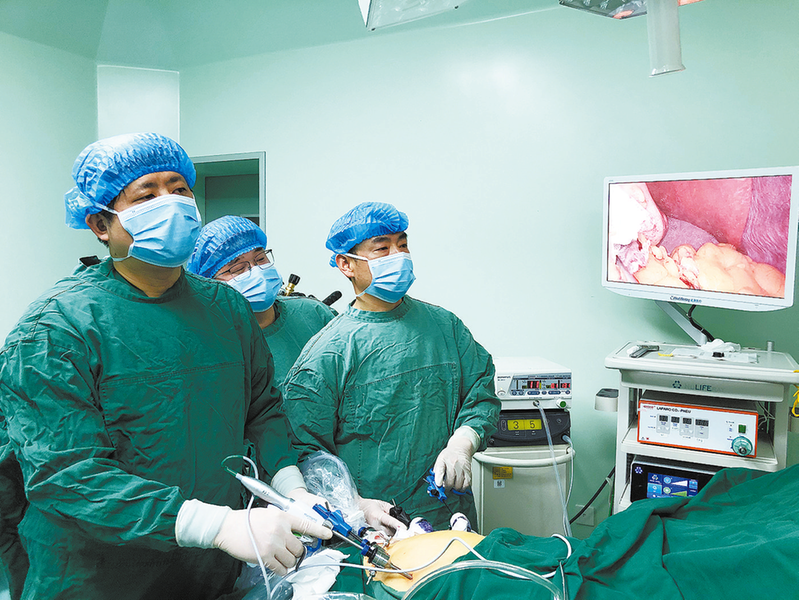 “組團(tuán)式”幫扶商南縣醫(yī)院第一批工作隊(duì)隊(duì)員張文勇(左一)指導(dǎo)開展腹腔鏡微創(chuàng)手術(shù)