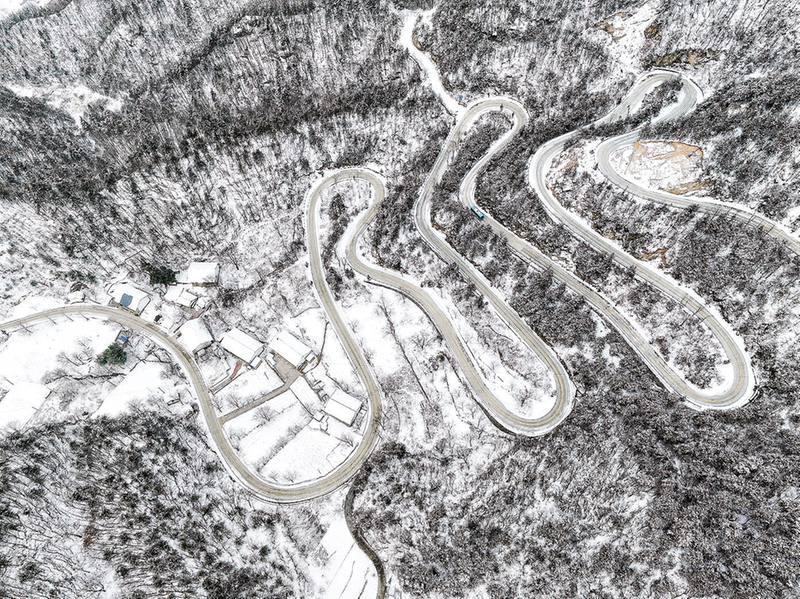 2月23日,俯瞰丹鳳縣界嶺,雪后的盤山公路猶如一條銀蛇蜿蜒而上。 (本報通訊員 郝建勛 攝)