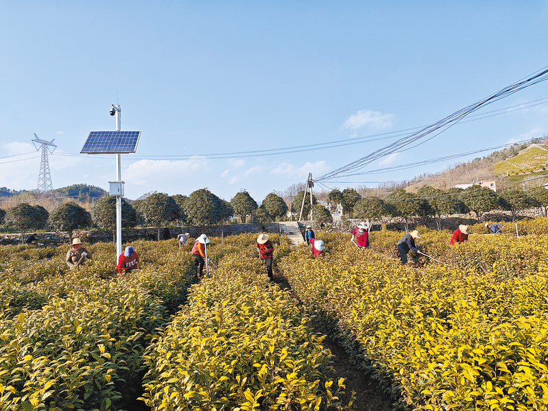 3月11日,在商南縣試馬鎮(zhèn)郭家埡村商南縣沁園春茶葉基地,60多名群眾正在為黃茶和龍井除草。(本報通訊員 萬小丹 攝)