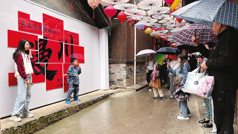 在山陽縣漫川古鎮(zhèn),游客在網(wǎng)紅打卡點(diǎn)拍照留念。(本報(bào)記者 方 方 攝)