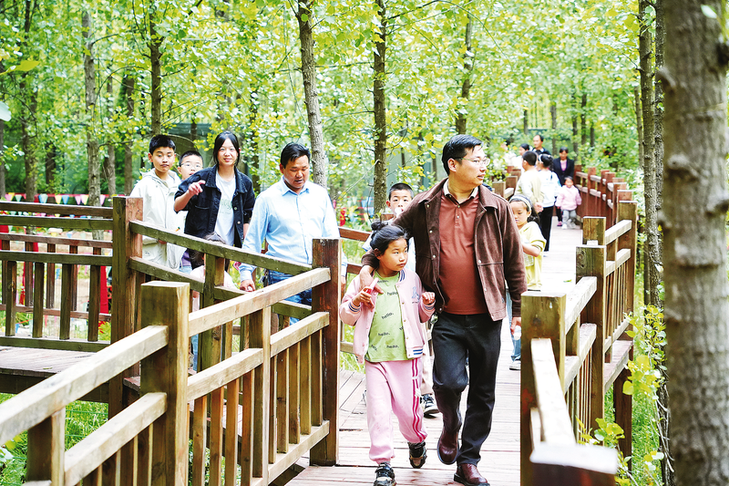 商南縣清油河鎮(zhèn)后灣景區(qū)里,游客漫步在百畝楊樹林中。