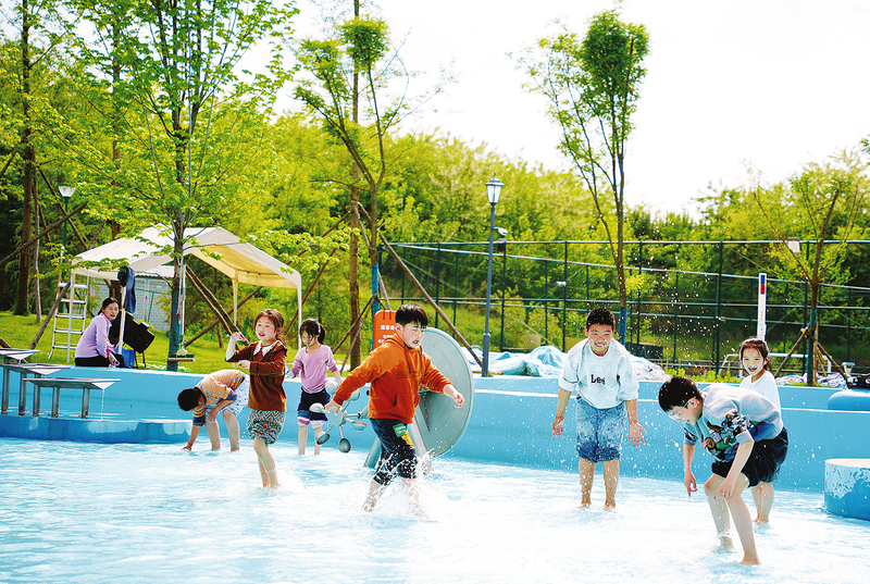 在秋沙鴨親子樂園的淺水泳池里,小朋友們打起了水仗。