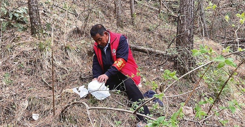 三月初,春花爛漫,綠草悠悠,筆者見到姜拴勞時(shí),他正在商山半山腰對(duì)枯樹根做防蟲處理。“今年防蟲工作我已經(jīng)干了兩個(gè)多月了,我要趕在清明節(jié)前將負(fù)責(zé)的林區(qū)病害樹木全部清理,這樣才能有效防止蟲害蔓延。”姜拴勞一邊忙著工作一邊說起自己最初的信仰。
