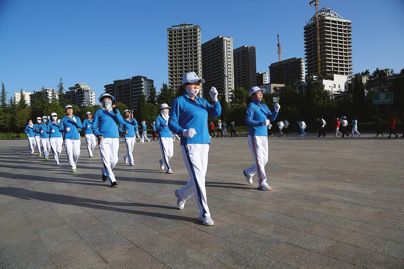 迎著朝陽,市民邁著矯健的步伐開展健步走活動。
