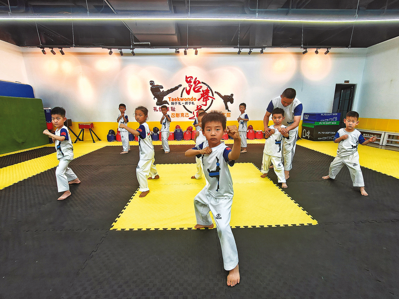 幼兒在教練指導(dǎo)下練習(xí)跆拳道