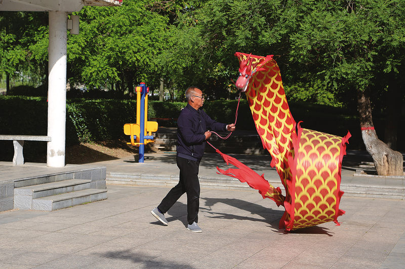在丹江公園的小廣場上,一位老人正在舞龍彩綢。