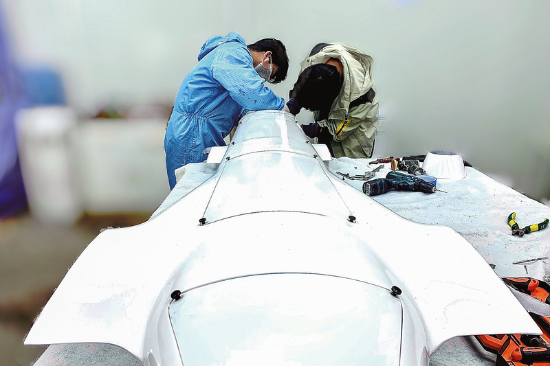 國飛領翼科技有限公司工作人員在生產(chǎn)廠房組裝無人機