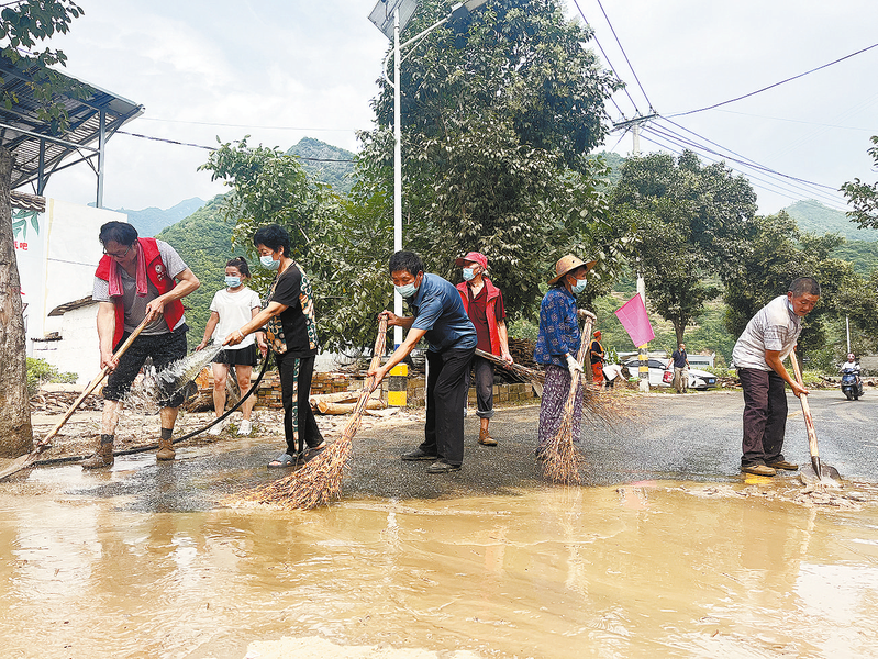 ?7月27日,山陽縣南寬坪鎮(zhèn)組建14支黨員突擊隊開展防汛救災(zāi)、道路清淤等工作。圖為洞溝村的突擊隊隊員帶領(lǐng)群眾清除道路堆積的淤泥,保證群眾安全出行。